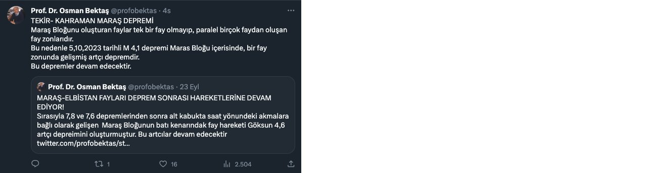 Bektaş "Maraş Bloğunu oluşturan faylar tek bir fay olmayıp, paralel birçok faydan oluşan fay zonlarıdır. Bu nedenle 5.10.2023 tarihli M 4,1 depremi Maraş Bloğu içerisinde, bir fay zonunda gelişmiş artçı depremdir." açıklamasında bulundu.